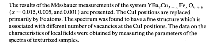 The results of the Mossbauer measurements of the system YBa2Cu3 _ x Fex 06 + δ (χ = 0.015,0.005, and 0.001) are presented. The Cul positions are replaced primarily by Fe atoms. The spectrum was found to have a fine structure which is associated with different number of vacancies at the Cul positions. The data on the characteristics of local fields were obtained by measuring the parameters of the spectra of texturized samples.