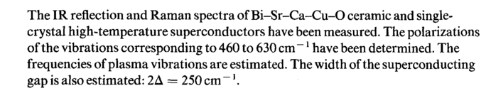 The IR reflection and Raman spectra of Bi-Sr-Ca-Cu-O ceramic and single-crystal high-temperature superconductors have been measured. The polarizations of the vibrations corresponding to 460 to 630 cm -1 have been determined. The frequencies of plasma vibrations are estimated. The width of the superconducting gap is also estimated: 2Δ = 250 cm-1.