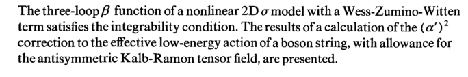 The three-loop/? function of a nonlinear 2D σ model with a Wess-Zumino-Witten term satisfies the integrability condition. The results of a calculation of the (a')2 correction to the effective low-energy action of a boson string, with allowance for the antisymmetric Kalb-Ramon tensor field, are presented.