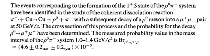 The events corresponding to the formation of the 1+S state of the ρ°π~ system have been identified in the study of the coherent dissociation reaction 7T~ *+ Cu -> Cu + p° + π~ with a subsequent decay of ap° meson into a/z +μ ~ pair at 50 GeV/c. The cross section of this process and the probability for the decay ρ°->μ +μ ~ have been determined. The measured probability value in the mass interval of the/?07T" system l.O-l^GeV/^isBr^^-= (4.6±0.2stat±0.2syst)XlO-5.