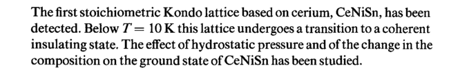 The first stoichiometric Kondo lattice based on cerium, CeNiSn, has been detected. Below Τ = 10 К this lattice undergoes a transition to a coherent insulating state. The effect of hydrostatic pressure and of the change in the composition on the ground state of CeNiSn has been studied.