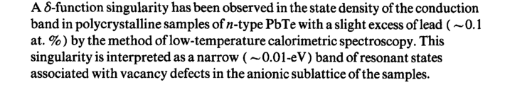 A 5-function singularity has been observed in the state density of the conduction band in polycrystalline samples of я-type PbTe with a slight excess of lead (— 0.1 at. %) by the method of low-temperature calorimetric spectroscopy. This singularity is interpreted as a narrow (— 0.01-е V) band of resonant states associated with vacancy defects in the anionic sublattice of the samples.