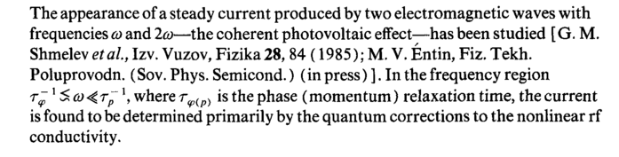 The appearance of a steady current produced by two electromagnetic waves with frequencies ω and 2ω—the coherent photovoltaic effect—has been studied [G. M. ShmelevetaL,Izv. Vuzov,Fizika28, 84 (1985); Μ. V. Entin, Fiz. Tekh. Poluprovodn. (Sov. Phys. Semicond.) (in press) ]. In the frequency region τ"1£ω<4ΤρΧ, where τφ(ρ) is the phase (momentum) relaxation time, the current is found to be determined primarily by the quantum corrections to the nonlinear rf conductivity.