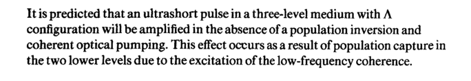 It is predicted that an ultrashort pulse in a three-level medium with Λ configuration will be amplified in the absence of a population inversion and coherent optical pumping. This effect occurs as a result of population capture in the two lower levels due to the excitation of the low-frequency coherence.