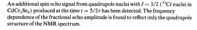An additional spin echo signal from quadrupole nuclei with / = 3/2 (53Cr nuclei in CdCr2Se4) produced at the time t = 5/2т has been detected. The frequency dependence of the fractional echo amplitude is found to reflect only the quadrupole structure of the NMR spectrum.