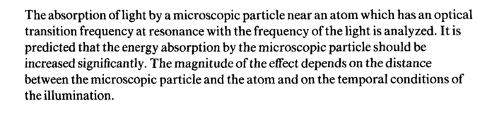 The absorption of light by a microscopic particle near an atom which has an optical transition frequency at resonance with the frequency of the light is analyzed. It is predicted that the energy absorption by the microscopic particle should be increased significantly. The magnitude of the effect depends on the distance between the microscopic particle and the atom and on the temporal conditions of the illumination.