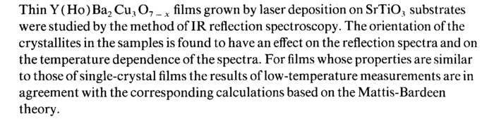 Thin Y (Ho) Ba2 Си, 07_x films grown by laser deposition on SrTi03 substrates were studied by the method of IR reflection spectroscopy. The orientation of the crystallites in the samples is found to have an effect on the reflection spectra and on the temperature dependence of the spectra. For films whose properties are similar to those of single-crystal films the results of low-temperature measurements are in agreement with the corresponding calculations based on the Mattis-Bardeen theory.
