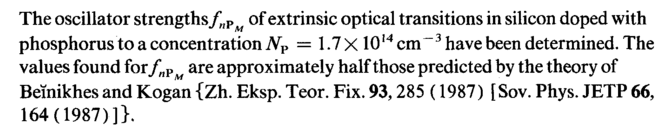 The oscillator strengths f„pM of extrinsic optical transitions in silicon doped with phosphorus to a concentration NP — 1.7 X 1014 cm-3 have been determined. The values found for/ÐòÍ are approximately half those predicted by the theory of Beinikhesand Kogan {Zh. Eksp. Teor. Fix. 93,285 (1987) [Sov. Phys. JETP 66, 164(1987)]},