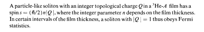 A particle-like soliton with an integer topological charge Q in a 3Ht-A film has a spin s — (fi/2)n\Q\, where the integer parameter η depends on the film thickness In certain intervals of the film thickness, a soliton with | Q \ = 1 thus obeys Fermi statistics.