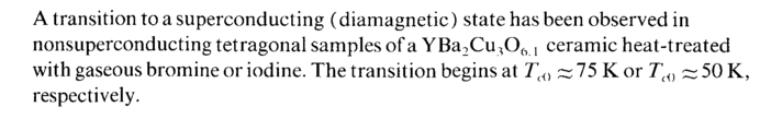 A transition to a superconducting (diamagnetic) state has been observed in nonsuperconducting tetragonal samples of a YBa2Cu30(1 { ceramic heat-treated with gaseous bromine or iodine. The transition begins at Tti) ~ 75 К or T<i} ~ 50 K, respectively.