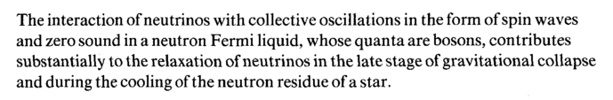 The interaction of neutrinos with collective oscillations in the form of spin waves and zero sound in a neutron Fermi liquid, whose quanta are bosons, contributes substantially to the relaxation of neutrinos in the late stage of gravitational collapse and during the cooling of the neutron residue of a star.
