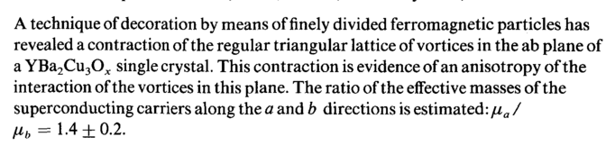 A technique of decoration by means of finely divided ferromagnetic particles has revealed a contraction of the regular triangular lattice of vortices in the ab plane of a YBa2Cu3Ox single crystal. This contraction is evidence of an anisotropy of the interaction of the vortices in this plane. The ratio of the effective masses of the superconducting carriers along the a and b directions is estimated:μα / μϋ = 1.4 + 0.2.