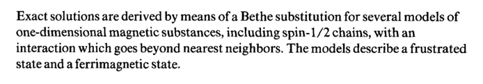 Exact solutions are derived by means of a Bethe substitution for several models of one-dimensional magnetic substances, including spin-1/2 chains, with an interaction which goes beyond nearest neighbors. The models describe a frustrated state and a ferrimagnetic state.