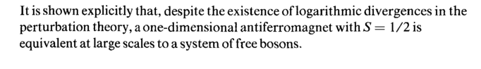 It is shown explicitly that, despite the existence of logarithmic divergences in the perturbation theory, a one-dimensional antiferromagnet with S = 1/2 is equivalent at large scales to a system of free bosons.