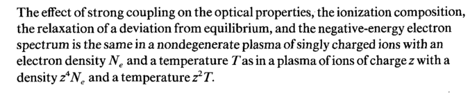 The effect of strong coupling on the optical properties, the ionization composition, the relaxation of a deviation from equilibrium, and the negative-energy electron spectrum is the same in a nondegenerate plasma of singly charged ions with an electron density Ne and a temperature Τ as in a plasma of ions of charge ζ with a density z4Ne and a temperature z2T.