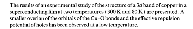 The results of an experimental study of the structure of a 3of band of copper in a superconducting film at two temperatures (300 К and 80 К) are presented. A smaller overlap of the orbitals of the Cu-O bonds and the effective repulsion potential of holes has been observed at a low temperature.