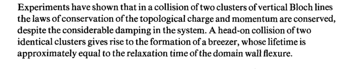 Experiments have shown that in a collision of two clusters of vertical Bloch lines the laws of conservation of the topological charge and momentum are conserved, despite the considerable damping in the system. A head-on collision of two identical clusters gives rise to the formation of a breezer, whose lifetime is approxima tely equal to the relaxation time of the domain wall flexure.