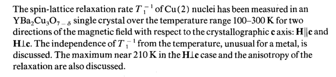 The spin-lattice relaxation rate Τ f1 of Cu(2) nuclei has been measured in an YBa2Cu307 _ £ single crystal over the temperature range 100-300 К for two directions of the magnetic field with respect to the crystallographic с axis: H||c and Hlc. The independence of Τ f1 from the temperature, unusual for a metal, is discussed. The maximum near 210 К in the Hlc case and the anisotropy of the relaxation are also discussed.