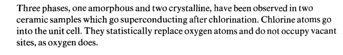 Three phases, one amorphous and two crystalline, have been observed in two ceramic samples which go superconducting after chlorination. Chlorine atoms go into the unit cell. They statistically replace oxygen atoms and do not occupy vacant sites, as oxygen does.