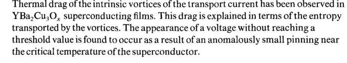 Thermal drag of the intrinsic vortices of the transport current has been observed in YBa2Cu3Ox superconducting films. This drag is explained in terms of the entropy transported by the vortices. The appearance of a voltage without reaching a threshold value is found to occur as a result of an anomalously small pinning near the critical temperature of the superconductor.