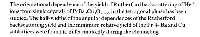 The orientational dependence of the yield of Rutherford backscattering of He ions from single crystals of PrBa2Cu307.._ δ in the tetragonal phase has been studied. The half-widths of the angular dependences of the Rutherford backscattering yield and the minimum relative yield of the Pr + Ba and Cu sublattices were found to diifer markedly during the channeling.