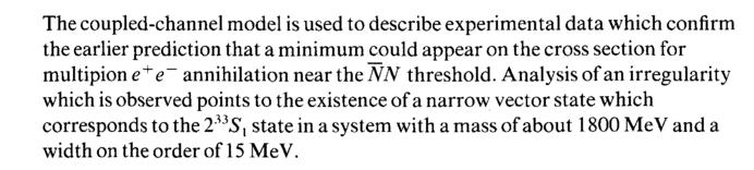 The coupled-channel model is used to describe experimental data which confirm the earlier prediction that a minimum could appear on the cross section for multipion e+e~ annihilation near the NN threshold. Analysis of an irregularity which is observed points to the existence of a narrow vector state which corresponds to the 2335, state in a system with a mass of about 1800 MeV and a width on the order of 15 MeV.