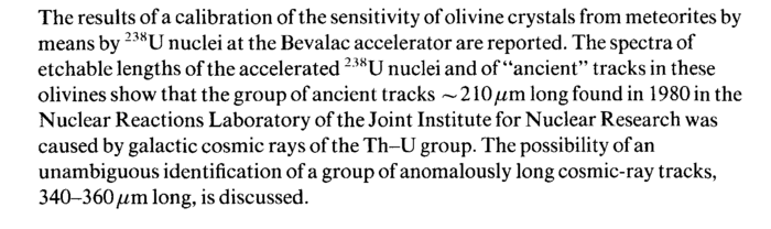 The results of a calibration of the sensitivity of olivine crystals from meteorites by means by 238U nuclei at the Bevalac accelerator are reported. The spectra of etchable lengths of the accelerated 238U nuclei and of "ancient" tracks in these olivines show that the group of ancient tracks —210 μτη long found in 1980 in the Nuclear Reactions Laboratory of the Joint Institute for Nuclear Research was caused by galactic cosmic rays of the Th-U group. The possibility of an unambiguous identification of a group of anomalously long cosmic-ray tracks, 340-360 μτη long, is discussed.