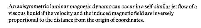 An axisymmetric laminar magnetic dynamo can occur in a self-similar jet flow of a viscous liquid if the velocity and the induced magnetic field are inversely proportional to the distance from the origin of coordinates.