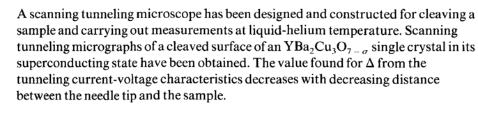 A scanning tunneling microscope has been designed and constructed for cleaving a sample and carrying out measurements at liquid-helium temperature. Scanning tunneling micrographs of a cleaved surface of an YBa2Cu307 _ σ single crystal in its superconducting state have been obtained. The value found for Δ from the tunneling current-voltage characteristics decreases with decreasing distance between the needle tip and the sample.