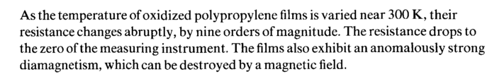 As the temperature of oxidized polypropylene films is varied near 300 K, their resistance changes abruptly, by nine orders of magnitude. The resistance drops to the zero of the measuring instrument. The films also exhibit an anomalously strong diamagnetism, which can be destroyed by a magnetic field.