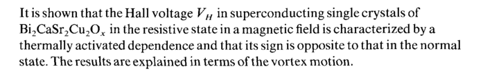 It is shown that the Hall voltage VH in superconducting single crystals of Bi2CaSr2Cu2Ox in the resistive state in a magnetic field is characterized by a thermally activated dependence and that its sign is opposite to that in the normal state. The results are explained in terms of the vortex motion.