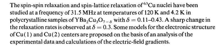 The spin-spin relaxation and spin-lattice relaxation of 63Cu nuclei have been studied at a frequency of 31.5 MHz at temperatures of 120 К and 4.2 К in polycrystalline samples of YBa2Cu307_(5 with δ = 0.11-0.43. A sharp change in the relaxation rates is observed at δ — 0.3. Some models for the electronic structure of Cu (1) and Cu (2) centers are proposed on the basis of an analysis of the experimental data and calculations of the electric-field gradients.