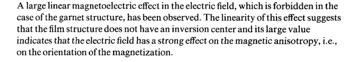 A large linear magnetoelectric effect in the electric field, which is forbidden in the case of the garnet structure, has been observed. The linearity of this effect suggests that the film structure does not have an inversion center and its large value indicates that the electric field has a strong effect on the magnetic anisotropy, i.e., on the orientation of the magnetization.