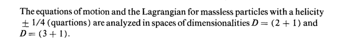 The equations of motion and the Lagrangian for massless particles with a helicity + 1/4 (quartions) are analyzed in spaces of dimensionalities