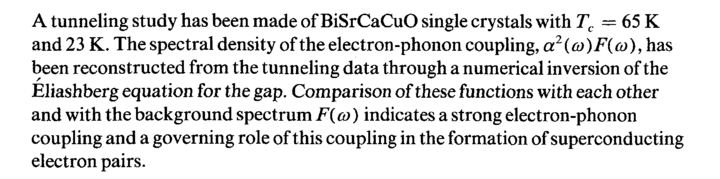 A tunneling study has been made of BiSrCaCuO single crystals with Tc = 65 К and 23 K. The spectral density of the electron-phonon coupling, a2 (ω) F( ω), has been reconstructed from the tunneling data through a numerical inversion of the Eliashberg equation for the gap. Comparison of these functions with each other and with the background spectrum F(co) indicates a strong electron-phonon coupling and a governing role of this coupling in the formation of superconducting electron pairs.