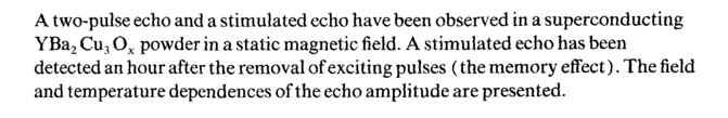 A two-pulse echo and a stimulated echo have been observed in a superconducting YBa2 Cu3 Ox powder in a static magnetic field. A stimulated echo has been detected an hour after the removal of exciting pulses (the memory effect). The field and temperature dependences of the echo amplitude are presented.