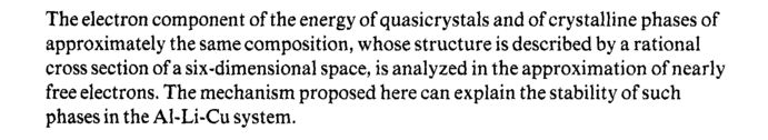 The electron component of the energy of quasicrystals and of crystalline phases of approximately the same composition, whose structure is described by a rational cross section of a six-dimensional space, is analyzed in the approximation of nearly free electrons. The mechanism proposed here can explain the stability of such phases in the Al-Li-Cu system.