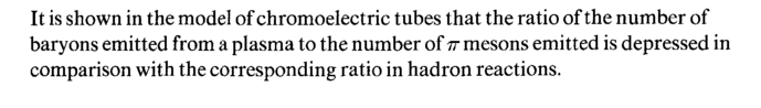 It is shown in the model of chromoelectric tubes that the ratio of the number of baryons emitted from a plasma to the number of π mesons emitted is depressed in comparison with the corresponding ratio in hadron reactions.