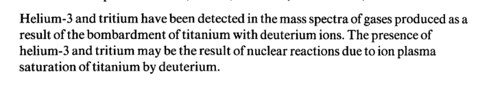 Helium-3 and tritium have been detected in the mass spectra of gases produced as a result of the bombardment of titanium with deuterium ions. The presence of helium-3 and tritium may be the result of nuclear reactions due to ion plasma saturation of titanium by deuterium.