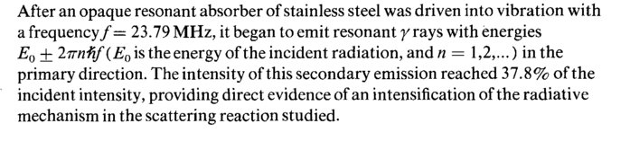 After an opaque resonant absorber of stainless steel was driven into vibration with a frequency/ = 23.79 MHz, it began to emit resonant γ rays with energies Eo ± 2πηϋ/(Ε0 is the energy of the incident radiation, and η = 1,2,...) in the primary direction. The intensity of this secondary emission reached 37.8% of the incident intensity, providing direct evidence of an intensification of the radiative mechanism in the scattering reaction studied.