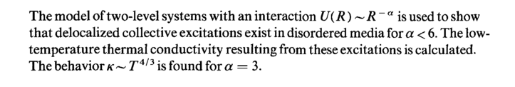 The model of two-level systems with an interaction U(R)~R~a is used to show that delocalized collective excitations exist in disordered media for a < 6. The low-temperature thermal conductivity resulting from these excitations is calculated. The behavior /с~ Т4/3 is found for a = 3.
