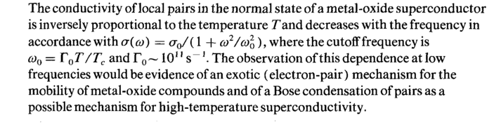 The conductivity of local pairs in the normal state of a metal-oxide superconductor is inversely proportional to the temperature Τ and decreases with the frequency in accordance with σ( ω) =σ0/(\ + ω2/ω%), where the cutoff frequency is ω0= Г0Т/ТС and Г0 ~10ns-J. The observation ofthis dependence at low frequencies would be evidence of an exotic (electron-pair) mechanism for the mobility of metal-oxide compounds and of a Bose condensation of pairs as a possible mechanism for high-temperature superconductivity.