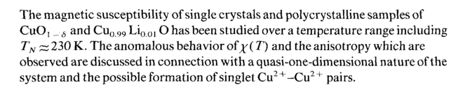 The magnetic susceptibility of single crystals and polycrystalline samples of CuOj __ δ and Cu0 99 Li0 01 О has been studied over a temperature range including TN ~230 K. The anomalous behavior σίχ(Τ) and the anisotropy which are observed are discussed in connection with a quasi-one-dimensional nature of the system and the possible formation of singlet Cu2+-Cu2+ pairs.