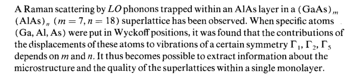 A Raman scattering by LO phonons trapped within an AlAs layer in a (GaAs) m (Al As) „ (m = 7, η = 18) superlattice has been observed. When specific atoms (Ga, Al, As) were put in Wyckoif positions, it was found that the contributions of the displacements of these atoms to vibrations of a certain symmetry Γ,, Γ2, Г5 depends on m and n. It thus becomes possible to extract information about the microstructure and the quality of the superlattices within a single monolayer.