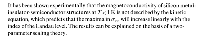 It has been shown experimentally that the magnetoconductivity of silicon metal-insulator-semiconductor structures at Τ< 1 К is not described by the kinetic equation, which predicts that the maxima in σχχ will increase linearly with the index of the Landau level. The results can be explained on the basis of a two-parameter scaling theory.