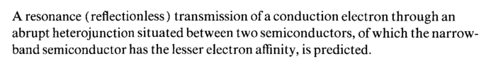 A resonance (reflectionless) transmission of a conduction electron through an abrupt heterojunction situated between two semiconductors, of which the narrowband semiconductor has the lesser electron affinity, is predicted.