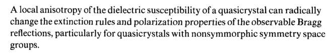 A local anisotropy of the dielectric susceptibility of a quasicrystal can radically change the extinction rules and polarization properties of the observable Bragg reflections, particularly for quasicrystals with nonsymmorphic symmetry space groups.