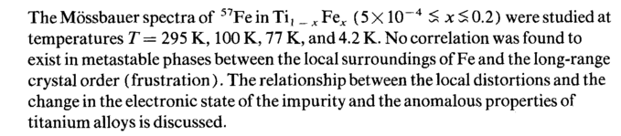 The Mossbauer spectra of 57Fe in Ti, _ x Fe^ (5X10~4 5*50.2) were studied at temperatures Τ = 295 К, 100 К, 77 К, and 4.2 К. No correlation was found to exist in metastable phases between the local surroundings of Fe and the long-range crystal order (frustration). The relationship between the local distortions and the change in the electronic state of the impurity and the anomalous properties of titanium alloys is discussed.