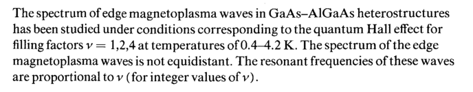 The spectrum of edge magnetoplasma waves in GaAs-AlGaAs heterostructures has been studied under conditions corresponding to the quantum Hall effect for filling factors ν = 1,2,4 at temperatures of 0.4-4.2 K. The spectrum of the edge magnetoplasma waves is not equidistant. The resonant frequencies of these waves are proportional to ν (for integer values of v).