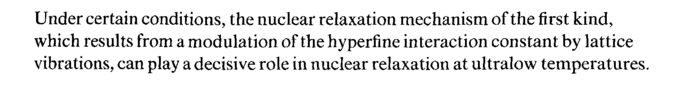 Under certain conditions, the nuclear relaxation mechanism of the first kind, which results from a modulation of the hyperfine interaction constant by lattice vibrations, can play a decisive role in nuclear relaxation at ultralow temperatures.